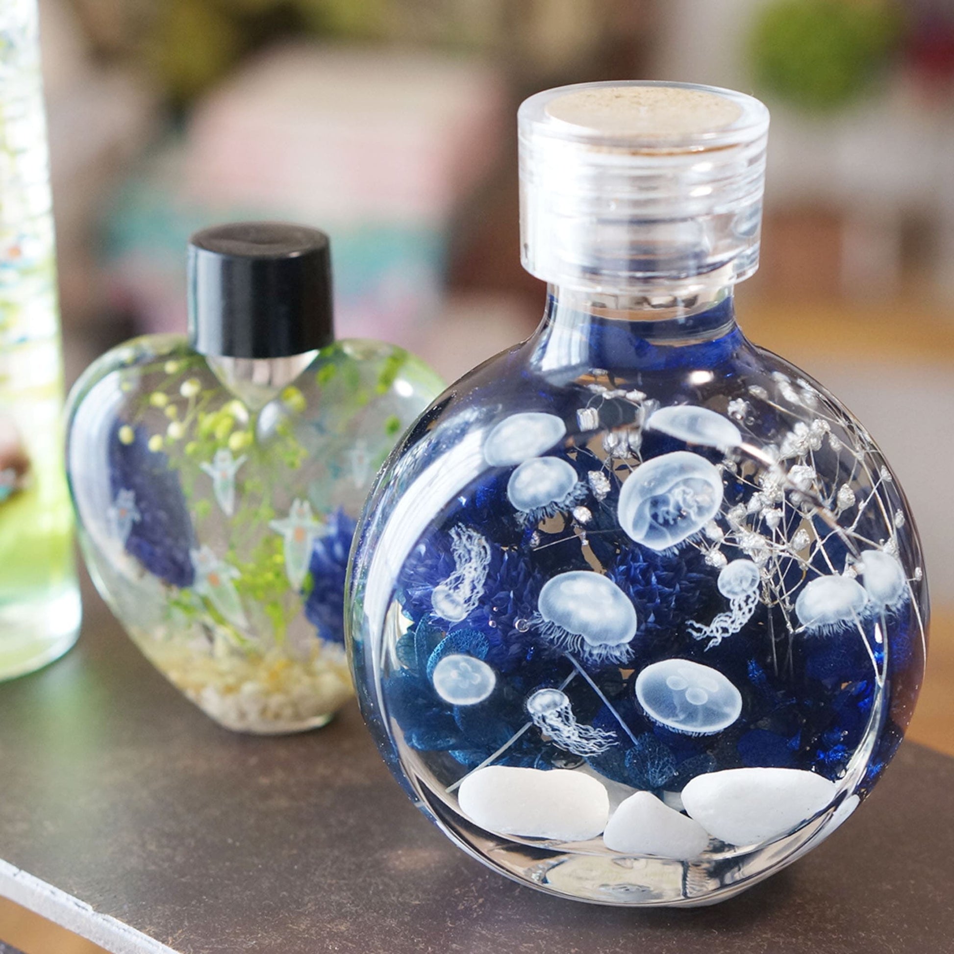瓶の中にクラゲ、プリザーブドフラワー、小石を入れてハーバリウムオイルを流し込みます。クラゲが泳いでいるようなオリジナルの水槽を作ります。