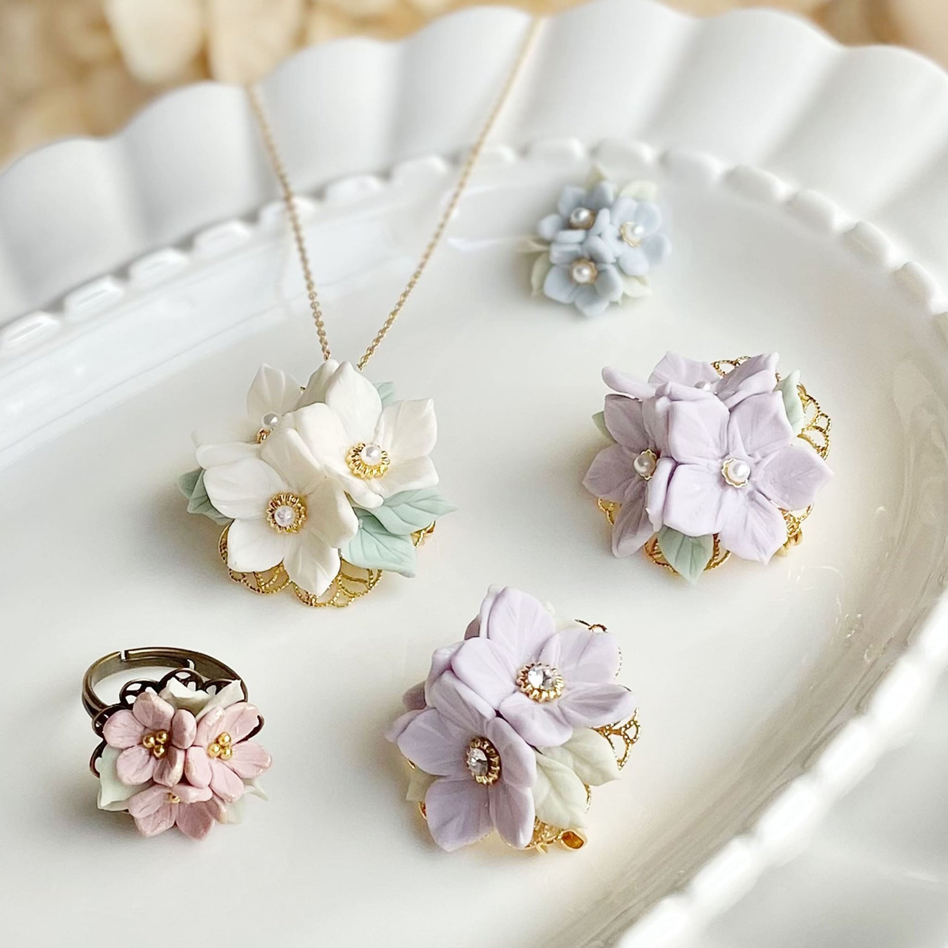 フリーハンドで作る、樹脂粘土のクリスマスローズのアクセサリー。花芯は数種類から選び、リング・ブローチ・ペンダントトップのいずれかをお作りいただけます。