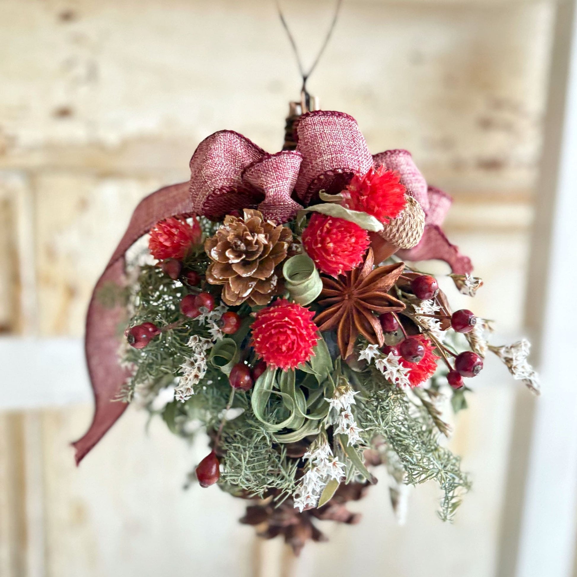 大きな松ぼっくりに鮮やかなドライフラワーをあしらったクリスマスオーナメントを作ります。クリスマスカラーの緑、赤、白のドライフラワーと、3種類の木の実を楽しく付けて仕上げていただきます。完成サイズは約14cm×22cm(ワイヤーを含む)